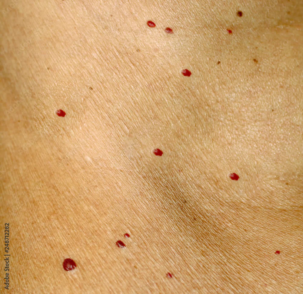 Angioma on the skin. Red moles on the body. Many birthmarks. Stock