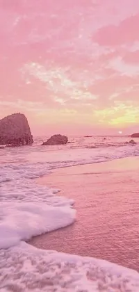 Download Pink Beach Sunset With Shimmering Waves Wallpaper