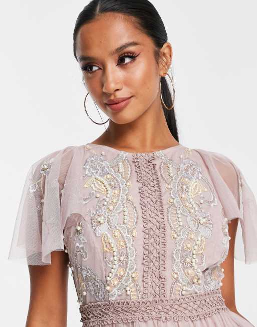 ASOS DESIGN Petite Bridesmaid pearl embellished flutter sleeve