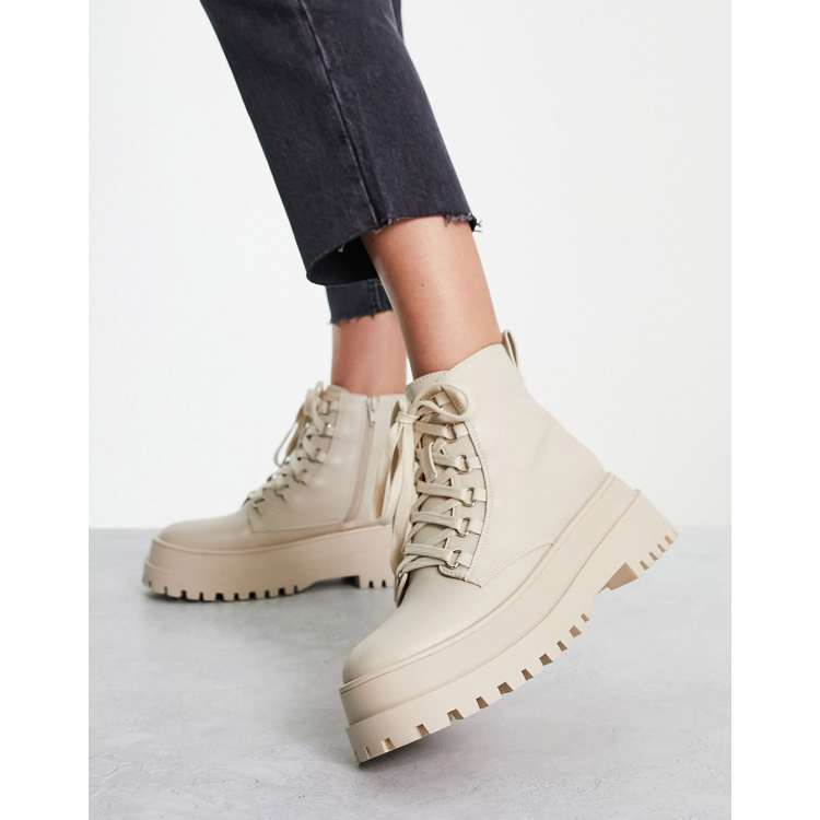 Cream top boots womens, London Rebel chunky lace up ankle boots in cream top