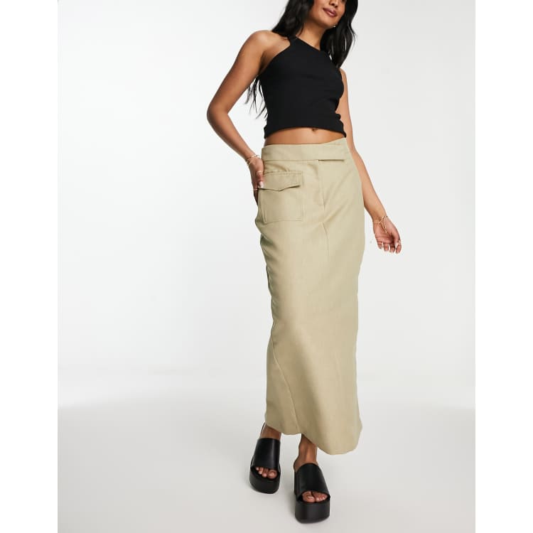 High Rise Pencil Khaki Midi Skirt with Washwell Gap