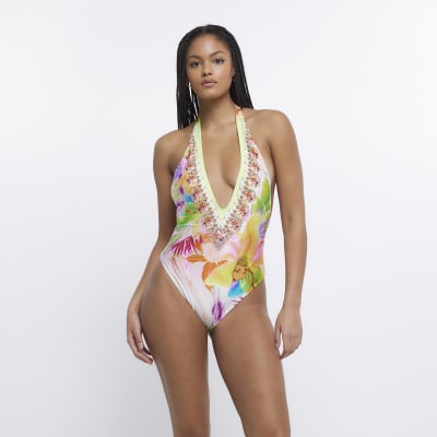 River top island swimwear, Yellow embellished plunge swimsuit River Island top