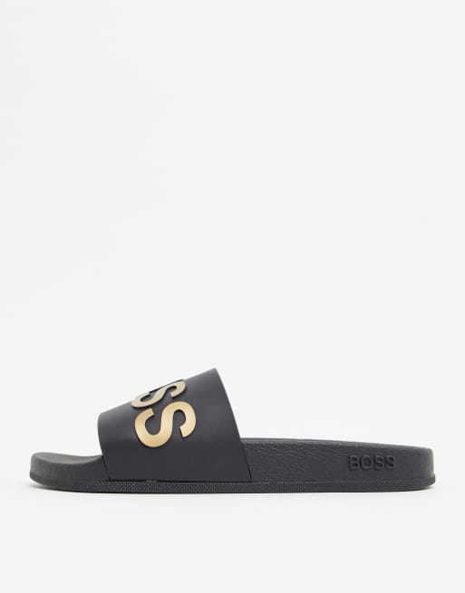 Hugo boss sliders top black and gold, BOSS Bay sliders in black and gold ASOS top