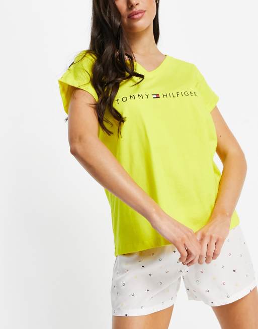 Tommy Hilfiger cotton logo t shirt and short pyjama set in neon