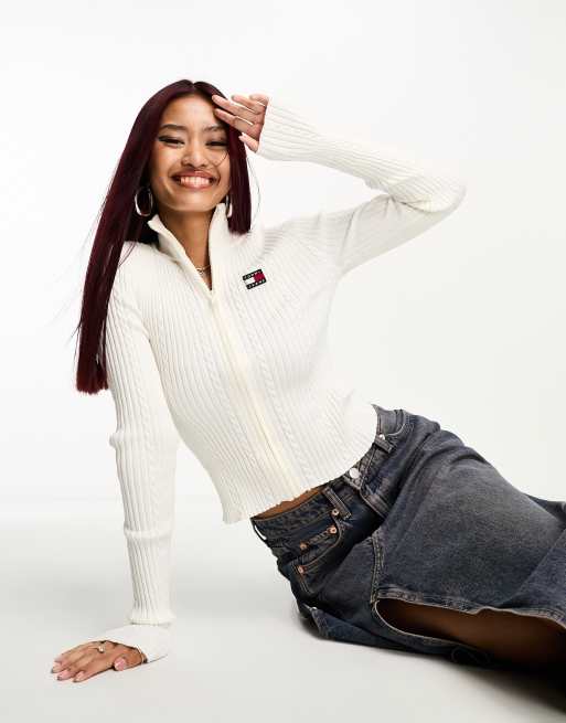 Tommy Jeans badge zip thru cable knit jumper in white ASOS