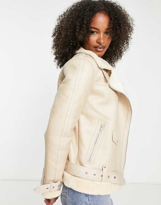 Topshop Tall faux leather shearling aviator biker jacket in ecru