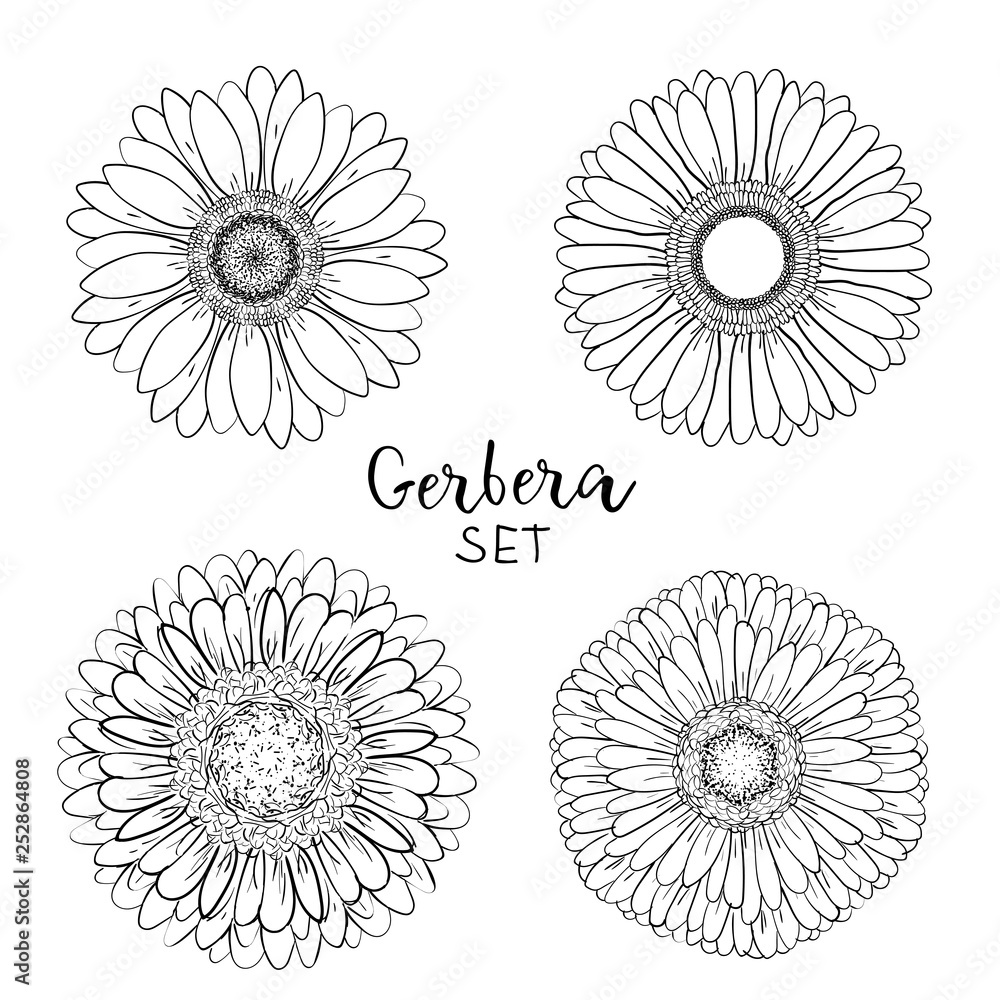 Set of 4 Open petals daisy head flower. Floral Botany drawings