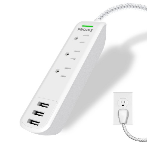 Philips 3 Outlet Grounded Braided Extension Cord with USB 3 Ports 3.4A 360J 6 Braided White