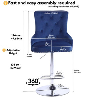 20 inch top stool with back, Bar Stools Set of 2 Adjustable Swivel Sapphire Blue Velvet Seat Chromed Steel Frame Footrest Base Breakfast Bar Stools with Back top