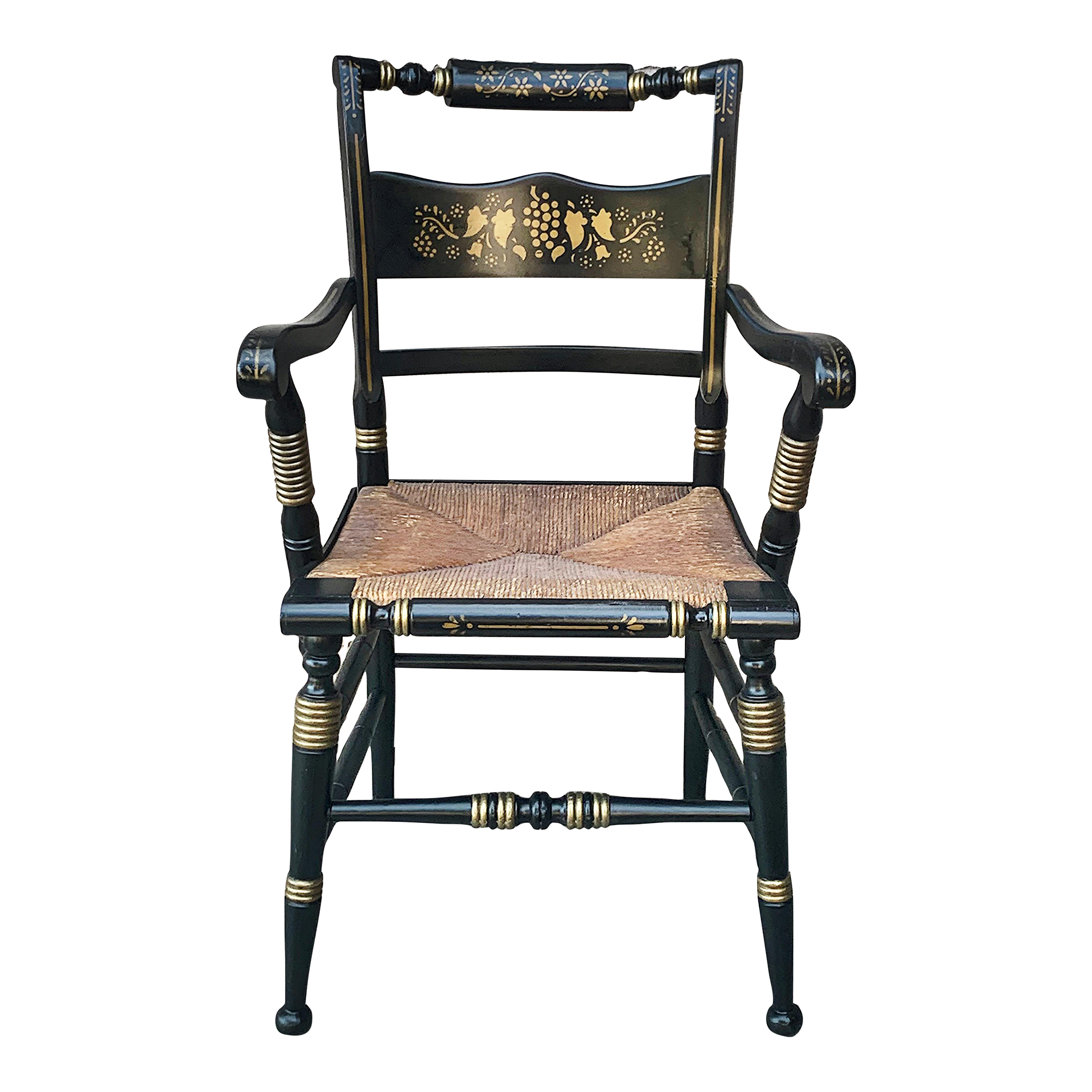 Hitchcock Stenciled Arm Chair Black and Gold With Rush Seat