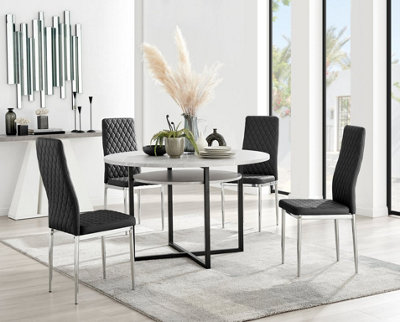 Adley Grey Concrete Effect And Black Round Dining Table with Storage Shelf and 4 Black and Silver Milan Modern Faux Leather Chairs